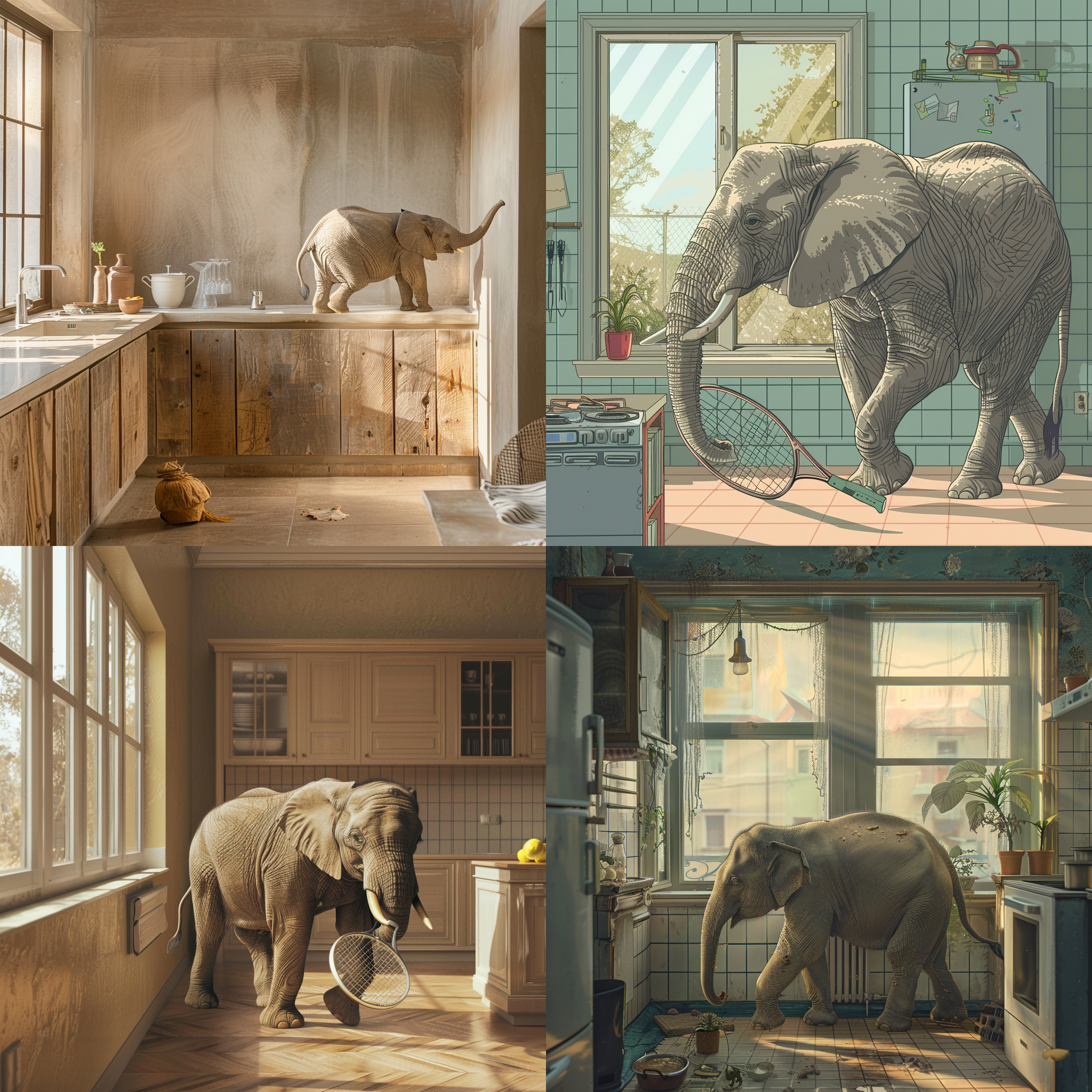 A clean kitchen with a racket A young elephant walking next to a window --seed 2228414388 --ar 1:1 --v 6 | 2024-03-17T11:31:36Z | |