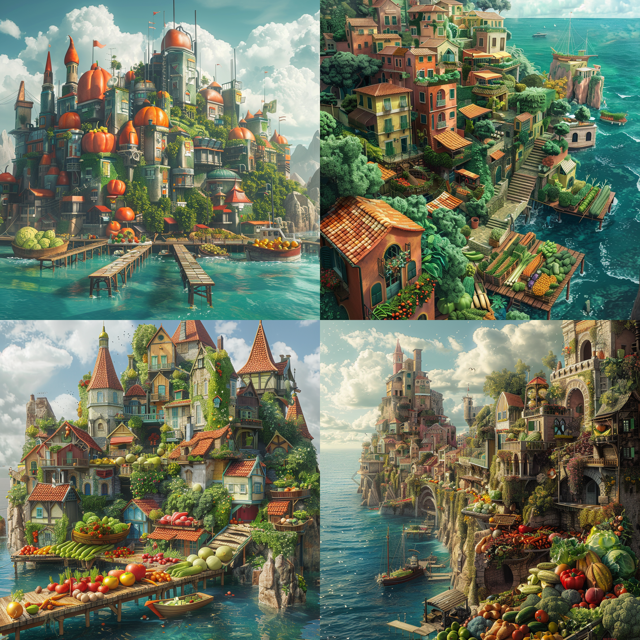 A city filled with some mixed veggies. next to a boat dock in the ocean --seed 3654727480 --ar 1:1 --v 6 | 2024-03-17T11:20:36Z | |