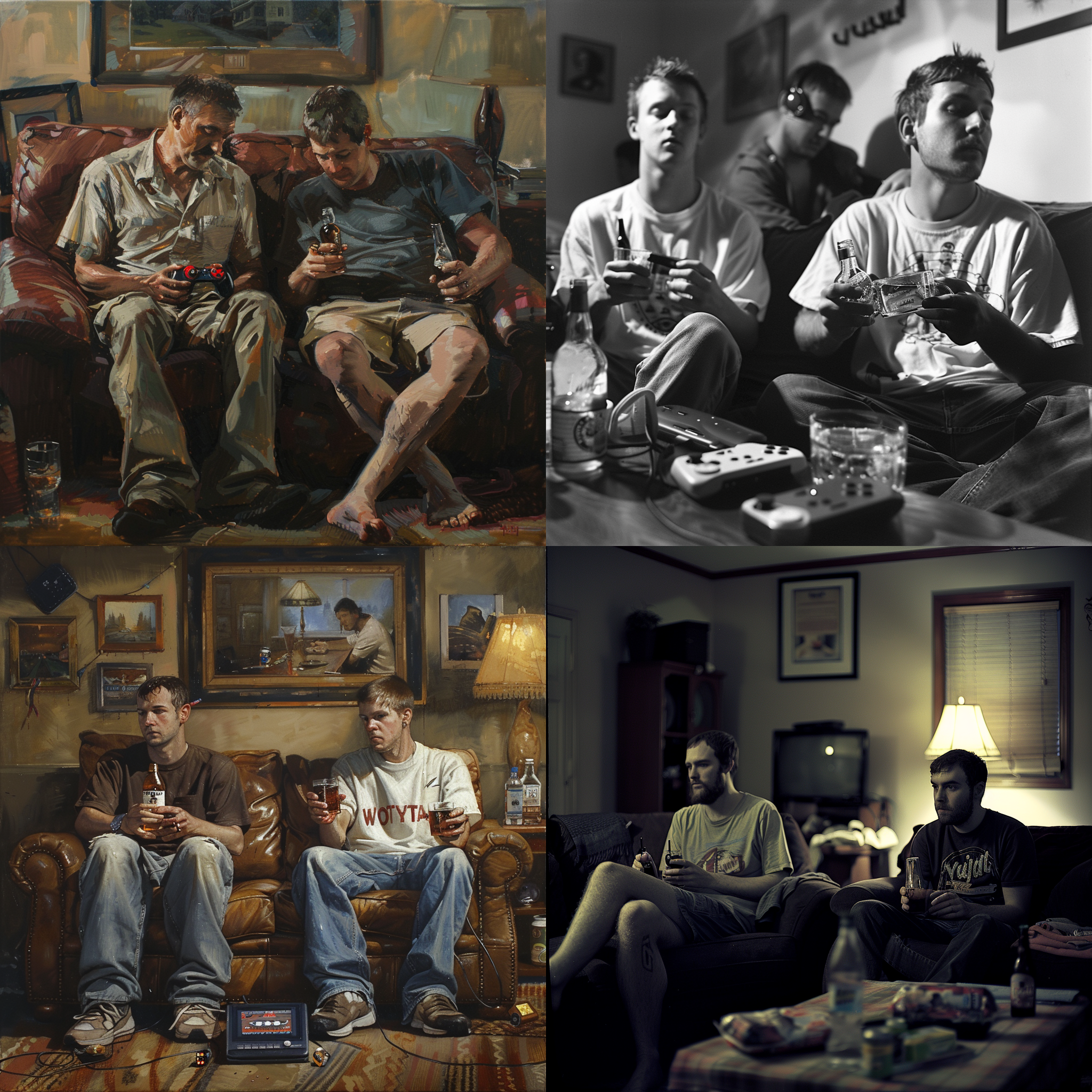 Men drinking and playing the Wii --seed 2012490126 --ar 1:1 --v 6 | 2024-03-17T11:24:04Z | |