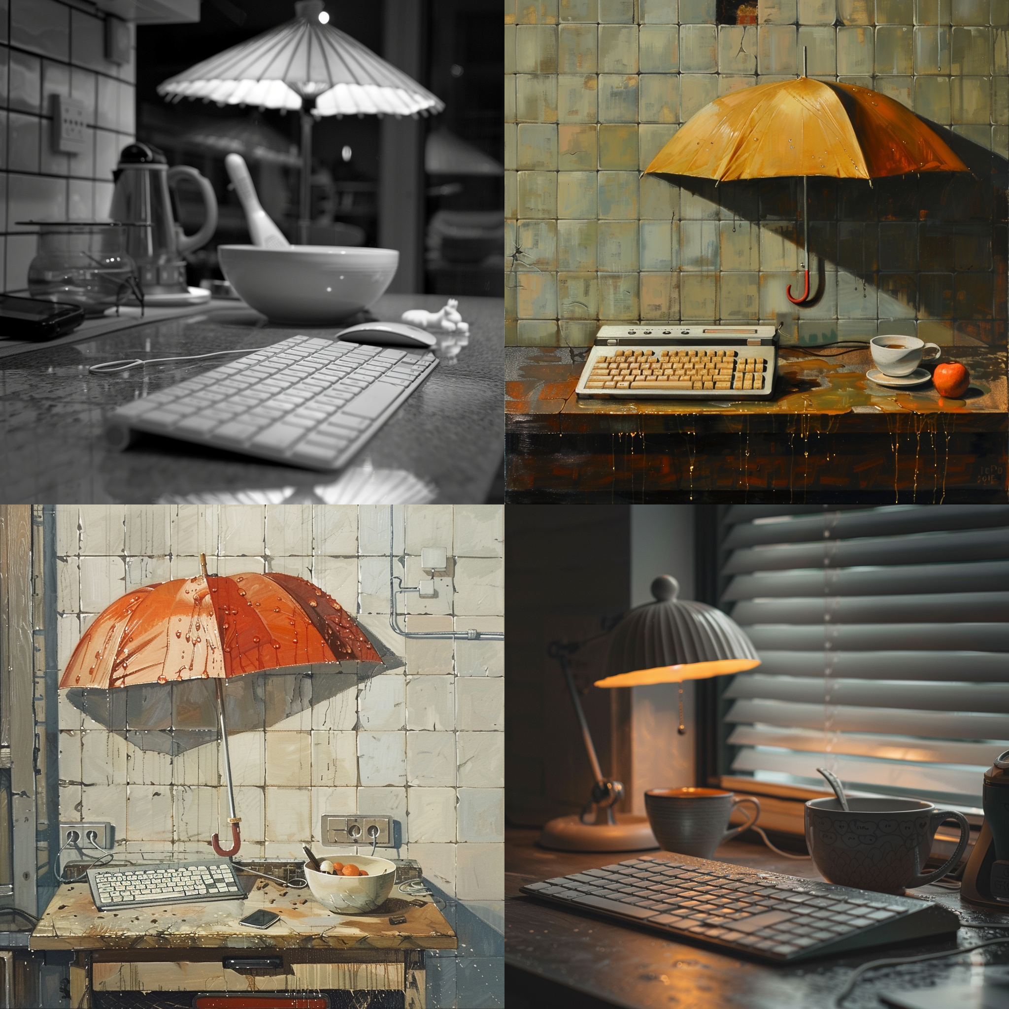 Keyboard on a counter top next to an umbrella a person in the bowl --seed 3282506422 --ar 1:1 --v 6 | 2024-03-17T11:22:58Z | |