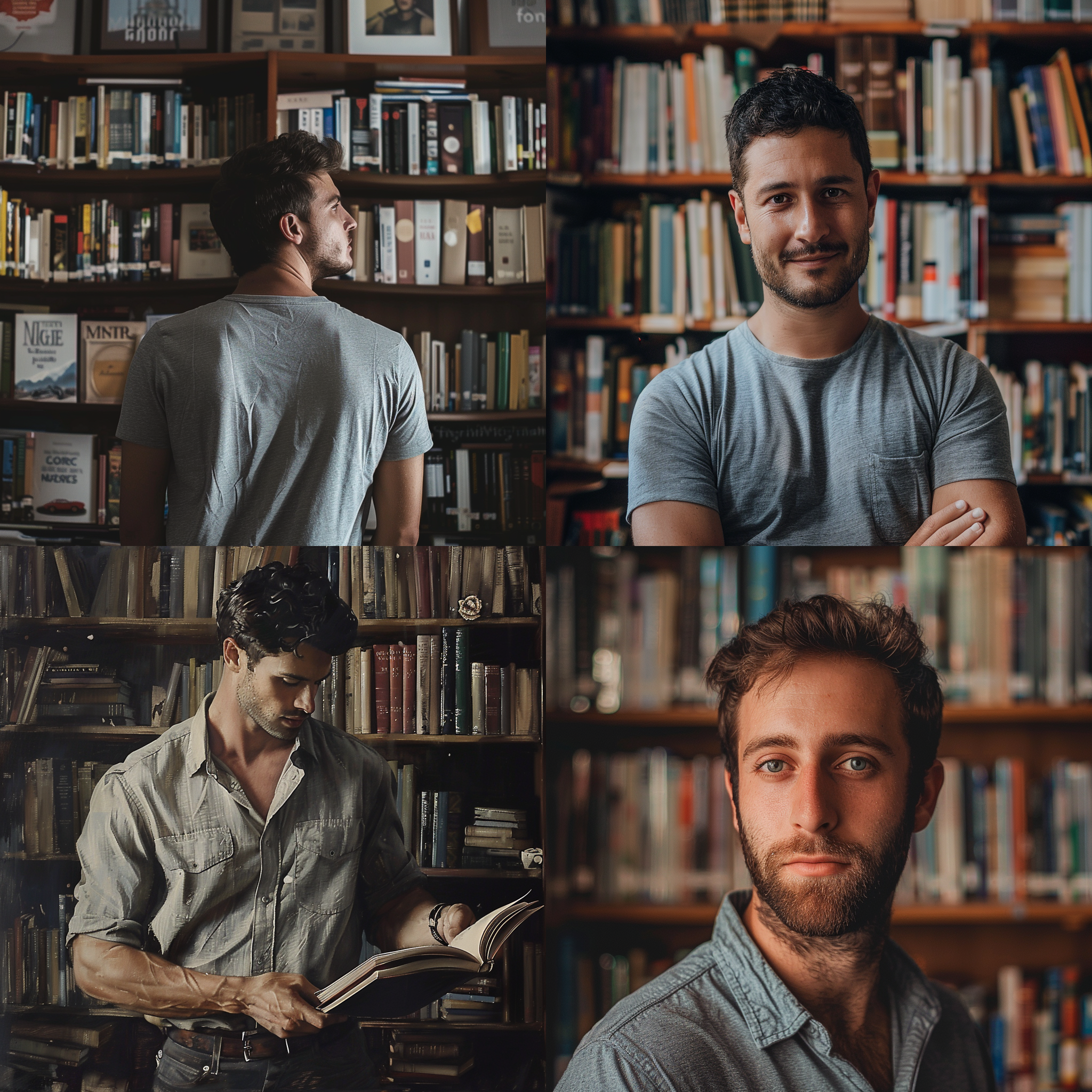 A man in grey shirt and a book shelf --seed 3504153699 --ar 1:1 --v 6 | 2024-03-17T11:27:42Z | |