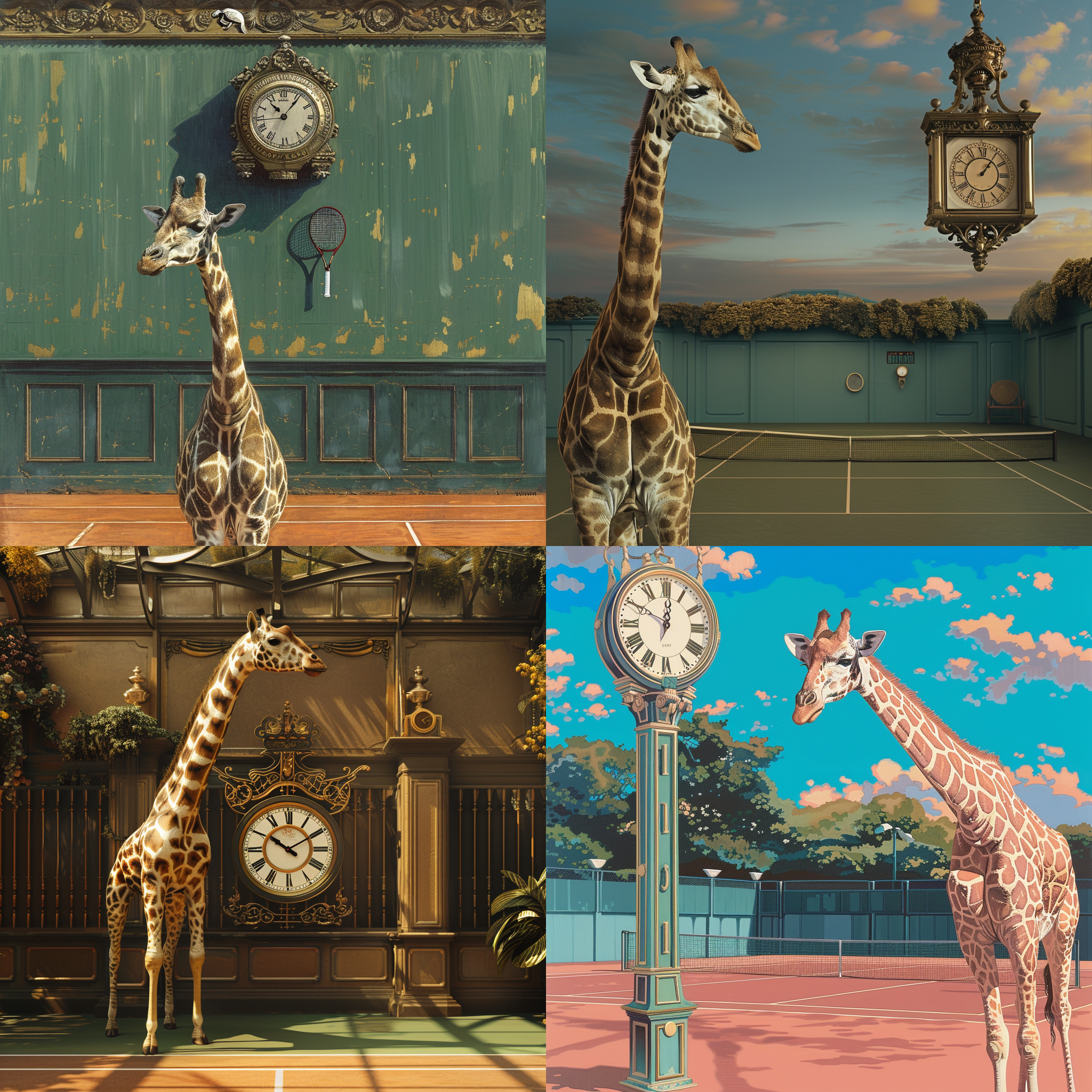 A giraffe is standing up by it An ornate clock hangs on the tennis court --seed 1632162766 --ar 1:1 --v 6 | 2024-03-17T11:26:09Z | |