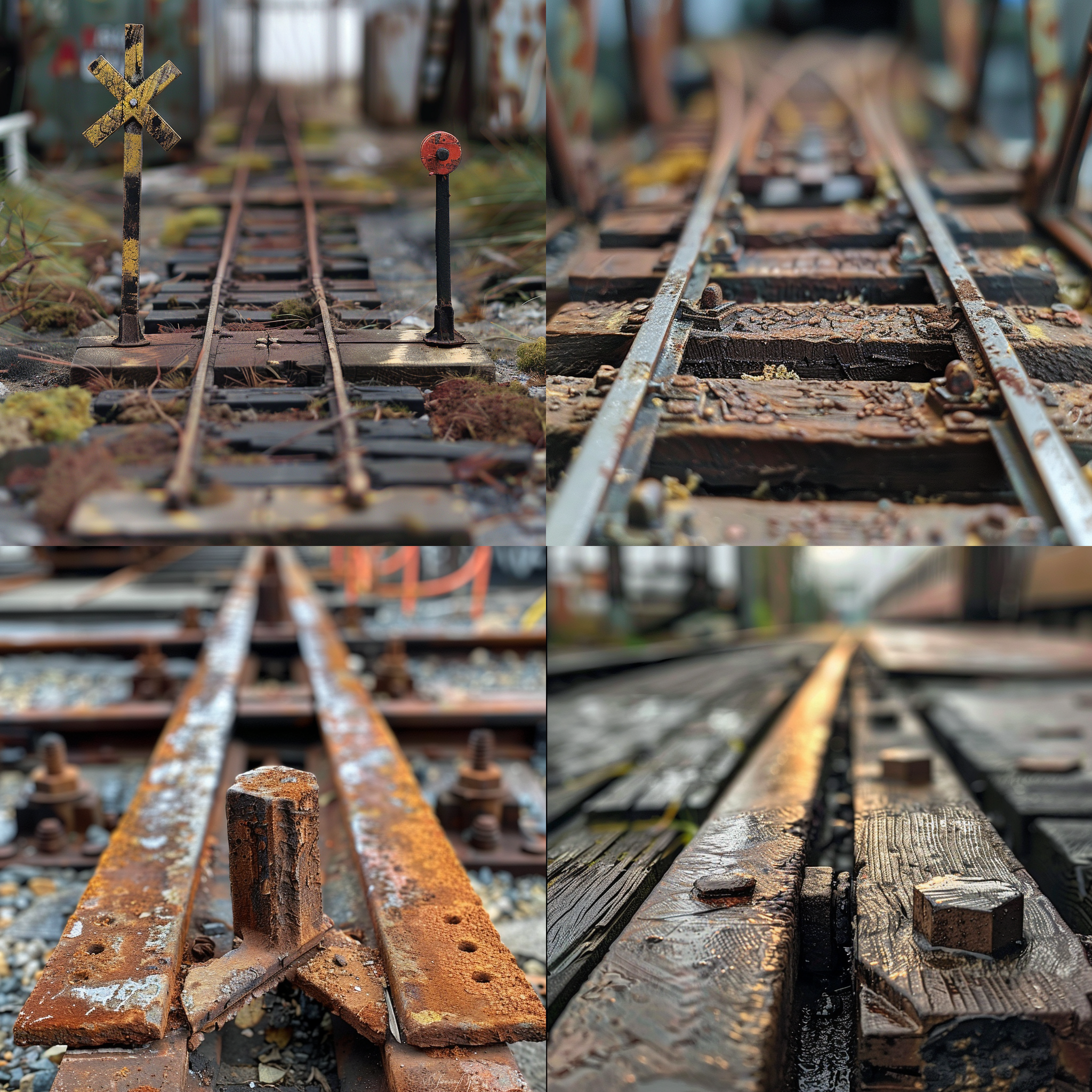Closeup of an old train track crossing meet --seed 1776139688 --ar 1:1 --v 6 | 2024-03-17T11:20:19Z | |