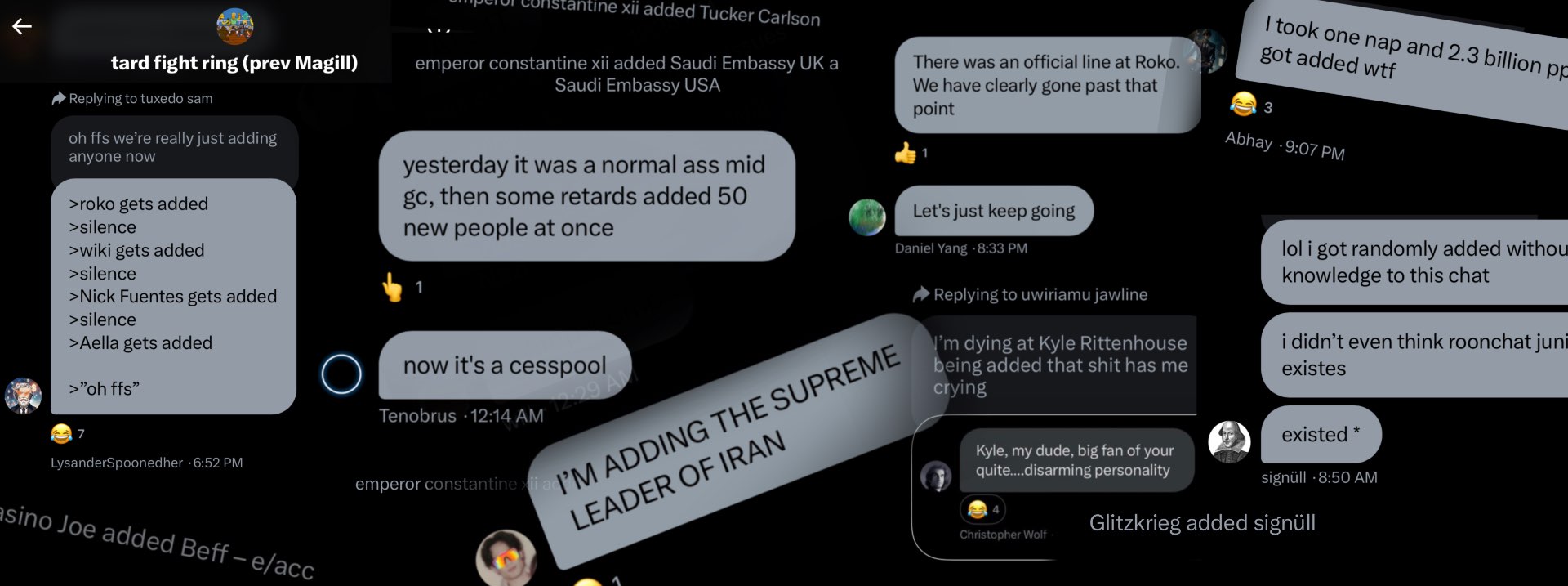 8sBbblQ7PJBJasGhJQJa | magill-tard-fight-what-proportion-o | 11224.190371599167 | Magill Tard Fight: What proportion of new gc members will actually participate (say something even once)? | 1718175179943 | dNDRBKODs0SA7nmcHz9IHJCcNLz2 | cpmm-multi-1 | 0 | 8.336628881733866 | True | plus | MKT | public | 1717644874912 | 8hqw | {"type": "doc", "content": [{"type": "paragraph", "content": [{"text": "Update: STOP THE COUNT", "type": "text", "marks": [{"type": "bold"}]}]}, {"type": "paragraph"}, {"type": "paragraph", "content": [{"text": "I’m no longer in a position to accurately resolve this market. ", "type": "text"}, {"text": "Don’t throw your mana at this.", "type": "text", "marks": [{"type": "bold"}]}, {"text": " I’m figuring out how to return it to you. ", "type": "text"}]}, {"type": "paragraph"}, {"type": "paragraph", "content": [{"text": "(What was the actual proportion? Guestimate: 10%–25%)", "type": "text"}]}, {"type": "paragraph"}, {"type": "paragraph", "content": [{"text": "———————", "type": "text"}]}, {"type": "paragraph"}, {"type": "paragraph", "content": [{"text": "You maniacs. You blew it up. God damn you all to hell.", "type": "text"}]}, {"type": "paragraph"}, {"type": "paragraph", "content": [{"text": "The state of things: ", "type": "text", "marks": [{"type": "bold"}]}, {"text": "The group chat is beyond cooked. New people keep chain migrating in, we have an absentee admin, and we can’t prune back the list with soft blocks anymore. All we can do is keep adding new members to hasten its demise.", "type": "text"}]}, {"type": "paragraph"}, {"type": "paragraph"}, {"type": "heading", "attrs": {"level": 1}, "content": [{"text": "Magill Tard Fight: ", "type": "text", "marks": [{"type": "bold"}]}, {"text": "How many of these new chat members will even participate? ", "type": "text"}]}, {"type": "paragraph"}, {"type": "paragraph", "content": [{"text": "• New members", "type": "text", "marks": [{"type": "bold"}]}, {"text": " means everyone since Wiki, inclusive. See below.", "type": "text"}]}, {"type": "paragraph", "content": [{"text": "• Participation", "type": "text", "marks": [{"type": "bold"}]}, {"text": " means saying something at least once. Reacts don’t count ", "type": "text"}, {"text": "but this does.", "type": "text", "marks": [{"type": "link", "attrs": {"href": "https://x.com/eriktorenberg/status/1798553219150569540?s=46&t=gcdKnObL8BaFoJiMdIdglQ", "class": "break-anywhere hover:underline hover:decoration-primary-400 hover:decoration-2 active:underline active:decoration-primary-400", "target": "_blank"}}]}]}, {"type": "paragraph", "content": [{"text": "• Chat members have insider knowledge, but outsiders are welcome to yolo into this. ", "type": "text"}]}, {"type": "paragraph", "content": [{"text": "• Closes in a week. ", "type": "text"}]}, {"type": "paragraph"}, {"type": "paragraph", "content": [{"text": "(This is baby’s first market, so I might have set up the options wrong. If I screw this up in a way where I can’t get the mana to the right people, I’ll give it back or whatever’s customary. ", "type": "text"}, {"text": "I’m not participating in the bet and have no stake in the outcome.", "type": "text", "marks": [{"type": "bold"}]}, {"text": ")", "type": "text"}]}, {"type": "paragraph"}, {"type": "paragraph", "content": [{"text": "————", "type": "text"}]}, {"type": "paragraph"}, {"type": "heading", "attrs": {"level": 1}, "content": [{"text": "New members: who counts?", "type": "text", "marks": [{"type": "bold"}]}]}, {"type": "paragraph"}, {"type": "paragraph", "content": [{"text": "This only goes for Twitter accounts run by actual individuals, which excludes most of Constantine’s shit adds. No corpo accounts, no Boeing, no Mossad, no DARPA, etc.", "type": "text"}]}, {"type": "paragraph"}, {"type": "paragraph", "content": [{"text": "List, ongoing: ", "type": "text", "marks": [{"type": "bold"}]}]}, {"type": "paragraph"}, {"type": "paragraph", "content": [{"text": "Erik Torenberg", "type": "text"}]}, {"type": "paragraph", "content": [{"text": "DJPN", "type": "text"}]}, {"type": "paragraph", "content": [{"text": "Shkreli", "type": "text"}]}, {"type": "paragraph", "content": [{"text": "Nick Fuentes", "type": "text"}]}, {"type": "paragraph", "content": [{"text": "Roger Stone", "type": "text"}]}, {"type": "paragraph", "content": [{"text": "Wiki", "type": "text"}]}, {"type": "paragraph", "content": [{"text": "SMA ", "type": "text"}]}, {"type": "paragraph", "content": [{"text": "Percival Perrins", "type": "text"}]}, {"type": "paragraph", "content": [{"text": "Kyle Rittenhouse", "type": "text"}]}, {"type": "paragraph", "content": [{"text": "Milo Yiannopoulos", "type": "text"}]}, {"type": "paragraph", "content": [{"text": "Aella", "type": "text"}]}, {"type": "paragraph", "content": [{"text": "Moby", "type": "text"}]}, {"type": "paragraph", "content": [{"text": "MI5", "type": "text"}]}, {"type": "paragraph", "content": [{"text": "Clocks", "type": "text"}]}, {"type": "paragraph", "content": [{"text": "Varunram Ganesh", "type": "text"}]}, {"type": "paragraph", "content": [{"text": "Val", "type": "text"}]}, {"type": "paragraph", "content": [{"text": "Normie Macdonald ", "type": "text"}]}, {"type": "paragraph", "content": [{"text": "Pico Paco", "type": "text"}]}, {"type": "paragraph", "content": [{"text": "Parm", "type": "text"}]}, {"type": "paragraph", "content": [{"text": "Bubble Boy", "type": "text"}]}, {"type": "paragraph", "content": [{"text": "Pariah the Doll", "type": "text"}]}, {"type": "paragraph", "content": [{"text": "15th Century Byzantine Idealogue Gemistos Plethon", "type": "text"}]}, {"type": "paragraph", "content": [{"text": "Mr. Shroom", "type": "text"}]}, {"type": "paragraph", "content": [{"text": "Beff Jezos", "type": "text"}]}, {"type": "paragraph", "content": [{"text": "Empathdoll", "type": "text"}]}, {"type": "paragraph", "content": [{"text": "Vitalist Dox", "type": "text"}]}, {"type": "paragraph", "content": [{