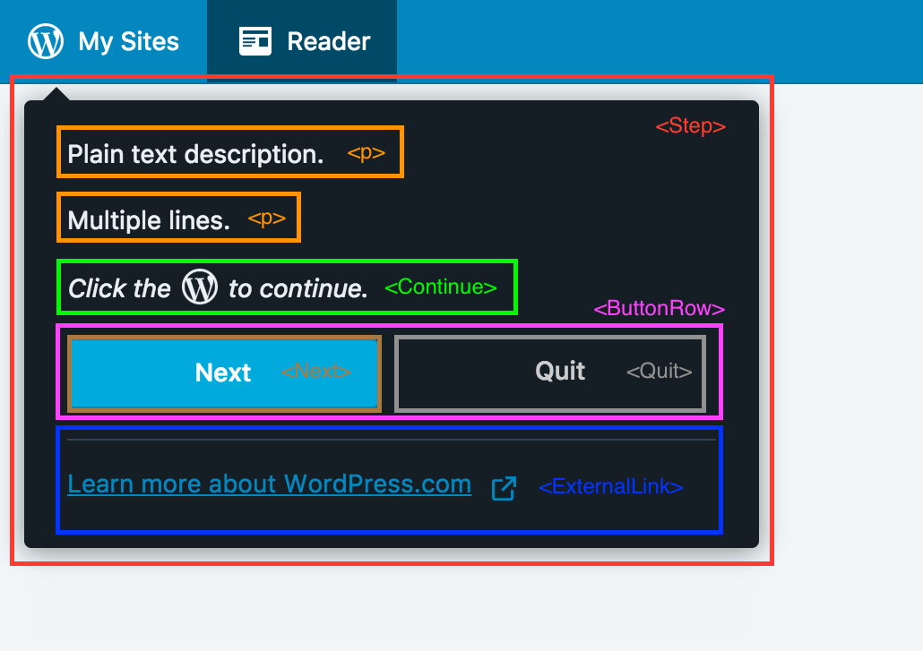 name: (string) Unique identifier of the step, used for addressing a step fromNextorContinue. Useinitto indicate the step that the tour should start with.target: (string, optional) Target which this step belongs to and which will be used for positioning. See Targeting elements in Calypso for more info about the format.placement: (string, optional) Placement. Possible values:below,above,beside,center,middle,right,left.arrow: (string, optional) If defined, the step will be rendered with an arrow on its border pointing in a given direction. Available: 'top-left', 'top-center', 'top-right', 'right-top', 'right-middle', 'right-bottom', 'bottom-left', 'bottom-center', 'bottom-right', 'left-top', 'left-middle', 'left-bottom'.style: (object, optional) Will be used as the step's inline style. Use sparingly and with caution for minor tweaks in positioning or z-indexes and avoid changing the look and feel of Guided Tours. If you use this in a way that could benefit all of Guided Tours globally, please consider creating an issue. Example:style={ { backgroundColor: 'red' } }wait: (function, optional) If defined, the step will be waiting untilwaitfunction has done. In case of returning aPromise, the step starts when resolved.when: (function, optional) This is a Redux selector that can prevent a step from showing when it evaluates to false. When usingwhenyou should also set thenextprop to tell Guided Tours the name of the step it should skip to. If you omit this prop, step will be rendered as expected. Example usage would be to show a certain step only for non-mobile environments:when={ not( isMobile ) }next: (string, optional) Define this to tell Guided Tours the name of the step it should skip to whenwhenevaluates to false.shouldScrollTo: (boolean, optional) Iftrue, the framework will attemp to scroll in case the target isn't visible.scrollContainer: (string, optional) This is a CSS selector for the container that the framework should attempt to scroll in case the target isn't visible. E.g. if the target is a menu item that could be invisible because of a scrolled sidebar, we'd want the framework to scroll the sidebar until the target is visible. The CSS selector to pass would then be.sidebar__region. Note: there were some differences for the sidebar between desktop and tablet that don't seem to be a problem anymore, but in any case have been documented in this issue.children: (component) Content of the step. Unlike most other components' children, this one takes a so called render prop as a single child. It's a component (function or class) to be rendered when the step is actually displayed. Thetranslatefunction is passed as a prop to the child component. The content is usually a paragraph of instructions and some controls for the tour. See below for available options. Note that all text content needs to be wrapped in<p>so it gets proper styling.onTargetDisappear: (function, optional) In some cases the target that a step points to will disappear after Guided Tours has rendered a step. In those cases we can end up with steps unhelpfully pointing at (0, 0). TheonTargetDisappearprop takes a function that will be called when the framework can't find the target anymore. The function will be passed an object containing two functions:quitandnext. In your callback you can decide how to handle the disappearing target and then use those functions to either quit the whole tour or proceed to the next step. This is e.g. used inchecklist-site-icon-tour.js.waitForTarget: (boolean, optional) If true, the step will only render when the target is visible. This is e.g. used in/marketing-connections-tour/index.js.