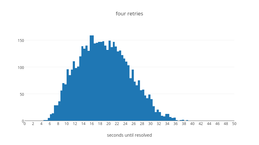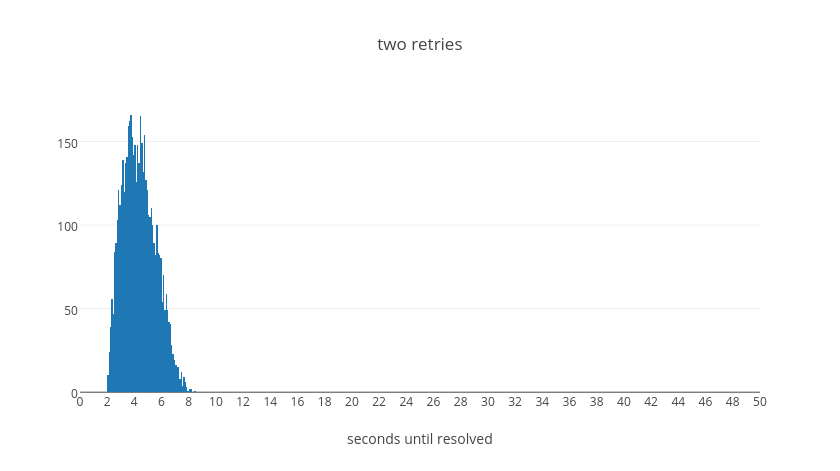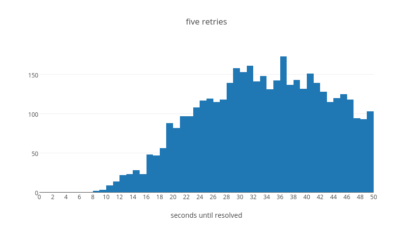 From this table we can see that in the average case even if a request takes five retry attempts it should be resolved within about 45 seconds. With four attempts, we can see that the vast majority will resolve within about 35s. With three attempts, almost everything will resolve within about 20s. With two attempts, everything within 10s. Finally with a single retry we will have resolution within 2s. These values were tuned experimentally to make a call on how long we believe it should take for a request to continue failing before we give up on it. We believe that if a request will succeed it should resolve in most cases in less than 40s overall.