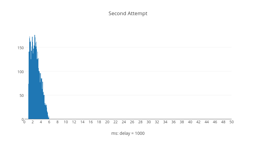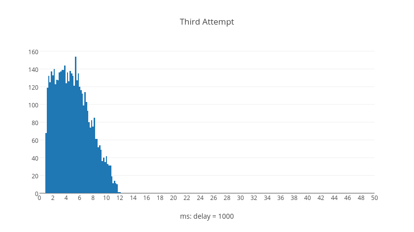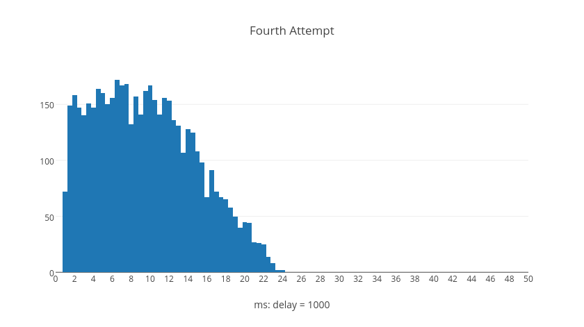 Surprisingly we can see from the graphs that it's possible for later retry attempts to have shorter delays than earlier retry attempts. However, if we examine what happens over the average total delay time when a request resolves after a given number of retries we can see a different picture. These next histograms show the total delay time for all requests given the number of retries, each with five thousand trial calculations.