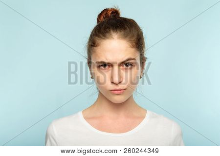 emotion face. frowning grumpy woman with pursed lips and piercing glance. young beautiful brown haired girl portrait on blue background. stock photo | 58,262 | |