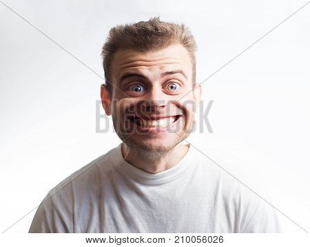 surprised man in a white t shirt on a white background with a cartoon face surprised by discounts shocked facial expression big smile | 76,899 | |