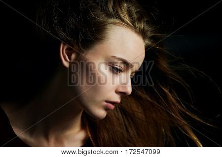 Beautiful girl looking to the side, in profile, Hair flying. Drama. Studio photography in low key on a background | 94,367 | |