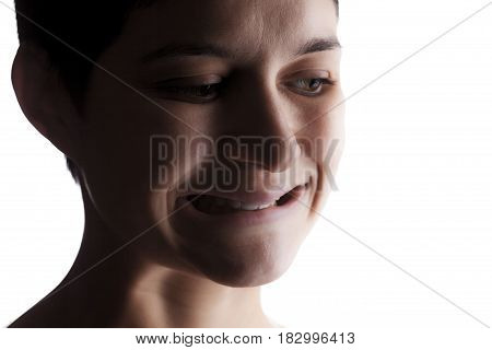 Fun Girl On Black Background Looking At Nose Making Grimace With Her Lips, Monochrome | 54,721 | |