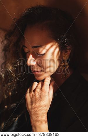 Conceptual Close Up Fashion Portrait Of Beautiful Woman With Curly Hair In Dark Tone. Amazing Warm S | 109,463 | |
