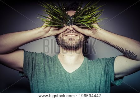 Cannabis, Concept of addiction to drugs, man with grass in eyes with gesture of happiness | 122,479 | |