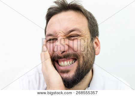 portrait of man yell of pain in front of grey background | 112 | |