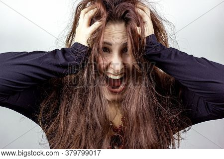 Stressed, Frightened And Screaming Young Mad Woman In Black Against Light Background. | 120,775 | |