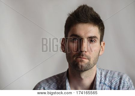 Young attractive cheerful man with dark hair with a beard in a shirt on a white background. Men's style. Male portrait | 87,638 | |