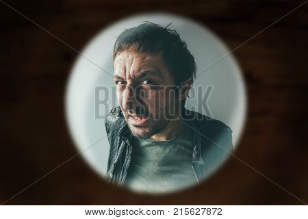 Angry man at the door viewed through spy hole debt collector or criminal knocking at the door | 70,745 | |