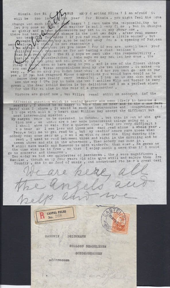 A letter written on behalf of Queen Elizabeth of Romania (the authoress 'Carmen Sylva') by her Private Secretary in August, 1907.