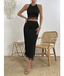 COOL AND CASUAL Black Self Design Skirt Top Set