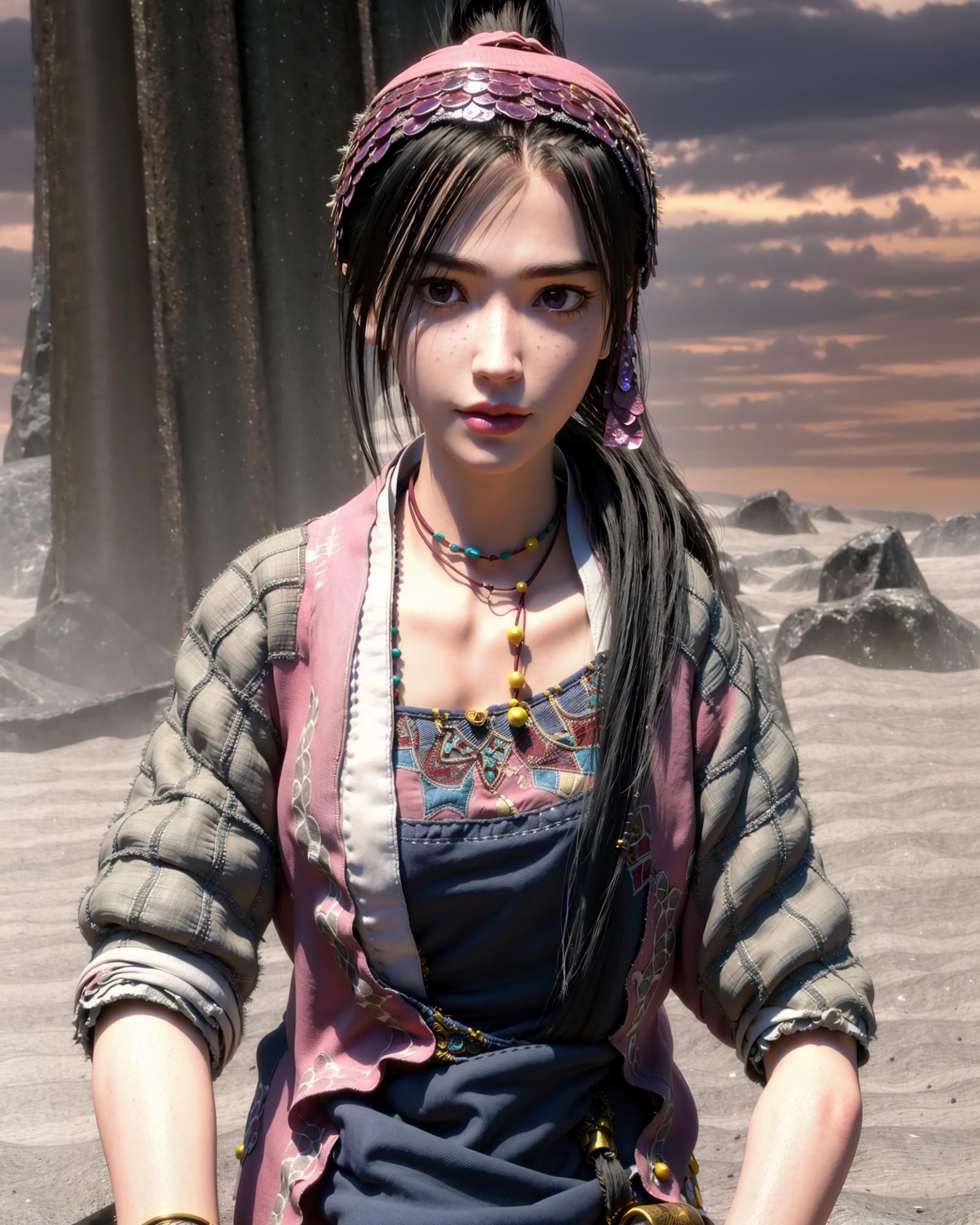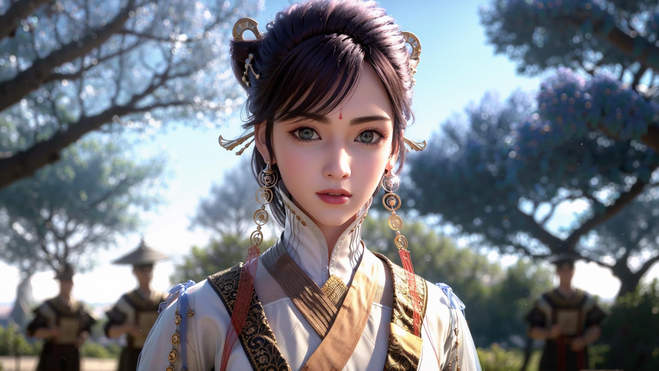 a woman with a ponytail and a bun in a video game character costume with a ponytail and a ponytail, (1girl:0.997), (blurry:1.000), (blurry background:1.000), (blurry foreground:0.999), (bokeh:0.831), (brown hair:0.880), (chinese clothes:0.894), (depth of field:1.000), (earrings:0.984), (hair ornament:0.947), (hair stick:0.888), (jewelry:0.968), (lips:0.863), (lipstick:0.688), (makeup:0.635), (motion blur:0.936), (nose:0.769), (outdoors:0.571), (solo:0.940),looking at viewer,