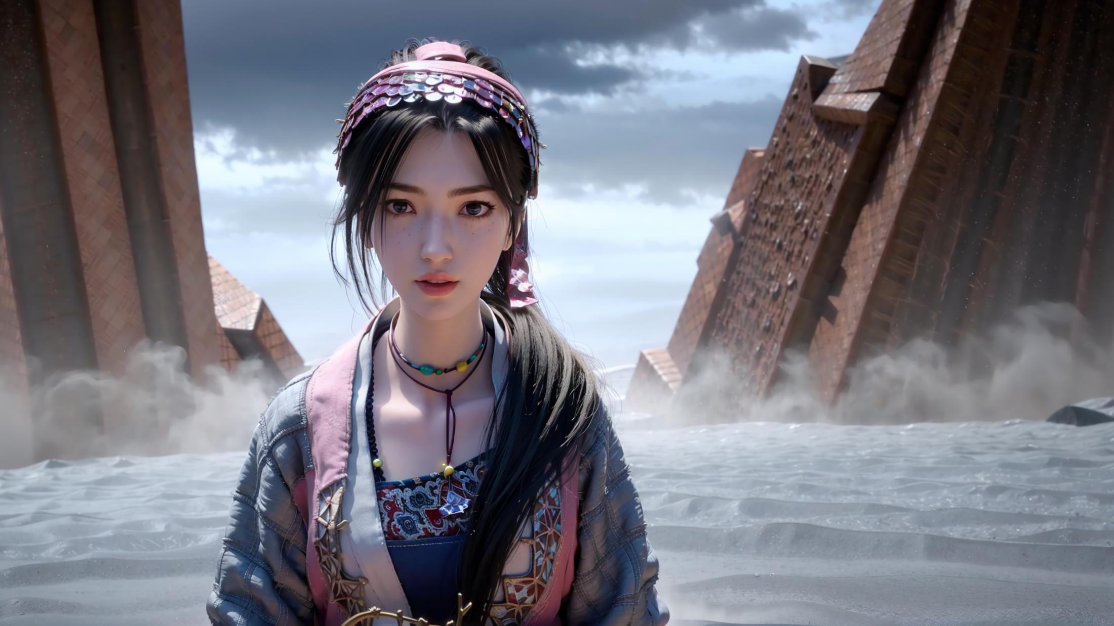 a woman with a cat earring and a white shirt and a tree in the background with a sky, (1girl:0.952), (3d:0.861), (blurry:1.000), (blurry background:1.000), (blurry foreground:1.000), (bokeh:0.896), (brown eyes:0.646), (brown hair:0.849), (chinese clothes:0.903), (day:0.538), (depth of field:1.000), (earrings:0.991), (hair ornament:0.723), (jewelry:0.967), (lips:0.796), (looking at viewer:0.838), (motion blur:0.989), (outdoors:0.702), (snow:0.546), (snowing:0.662), (solo:0.755), (tree:0.664)