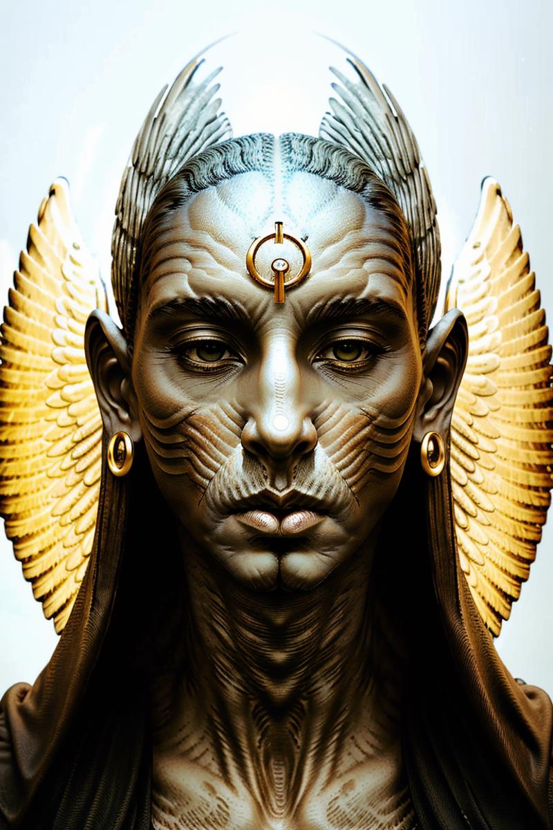 masterpiece, absurdres, highly detailed, photorealistic, realistic, wings, from_behind, looking_back, pants, belt, 1boy, (mature_male:1.8), (muscular_male:0.5)
