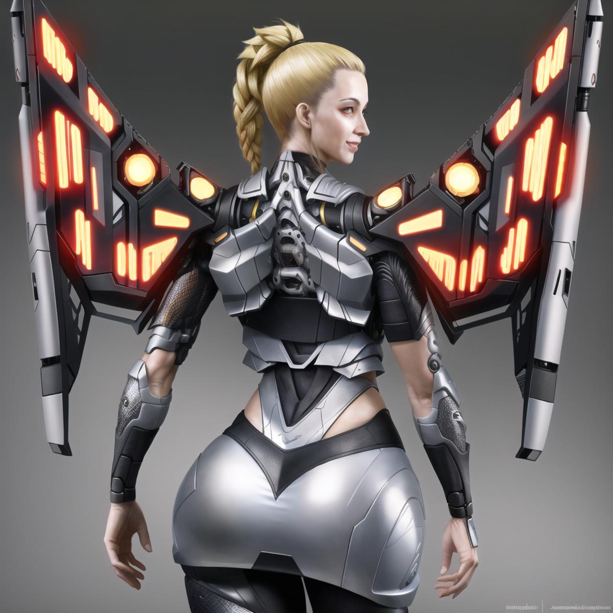 masterpiece, absurdres, highly detailed, photorealistic, realistic, cyberpunk, mechanical wings, wings, from_behind, looking_back, seductive smile, 1girl, (mature_female:1.8), (muscular_female:0.5)