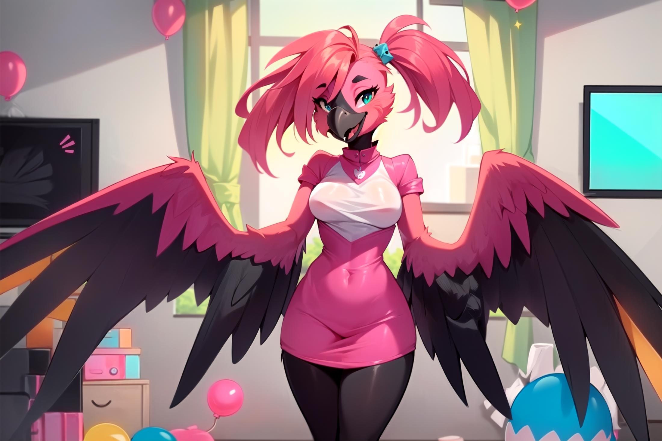 anthro avian bird, (beak), ((winged-arms)), sfw, female, wearing 80's party clothes, flirty pose, directional lighting, 2d, bright colors, at a house party, party decorations, in the 80's messy room, detailed background,