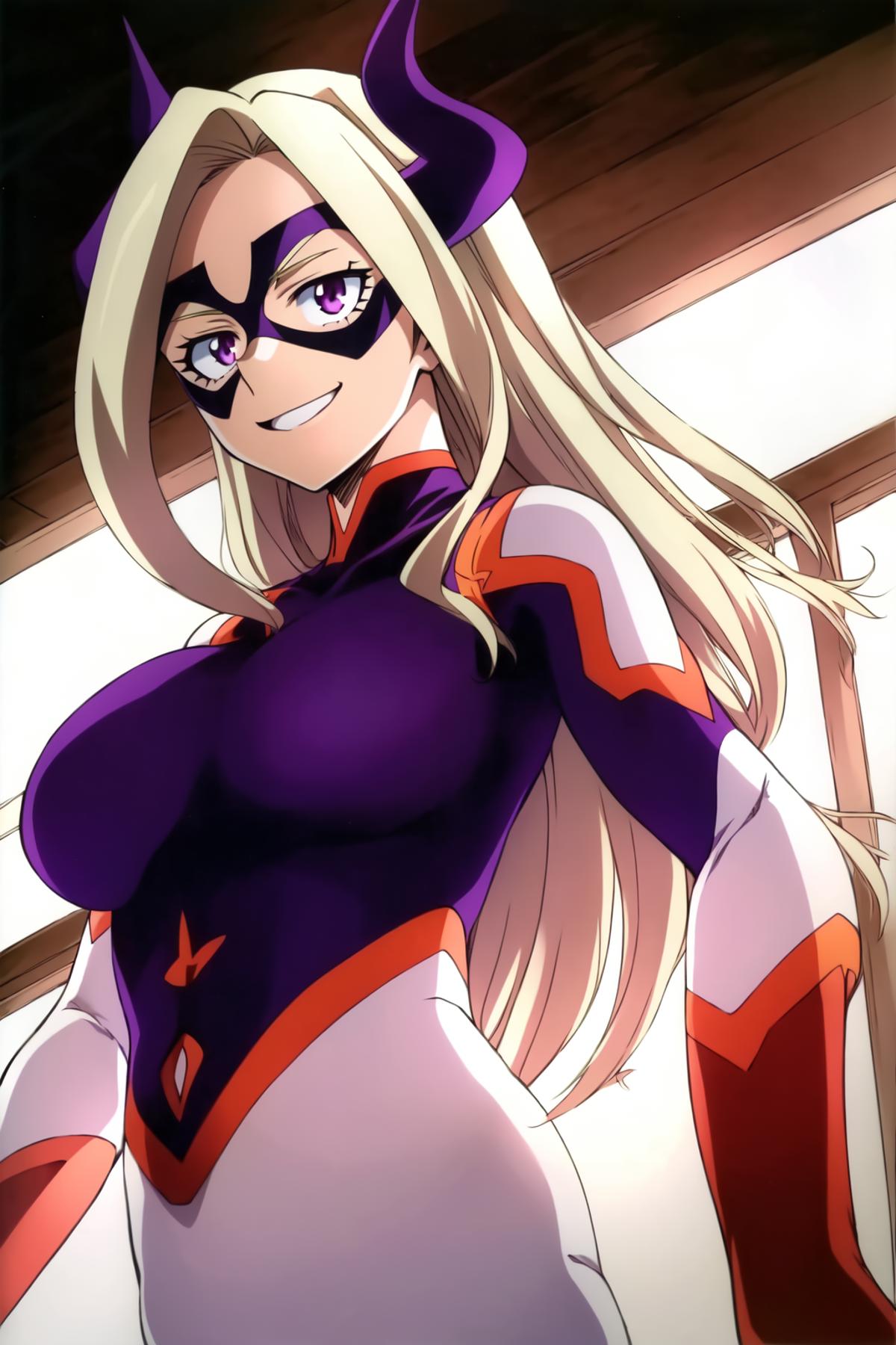scan, (extremely detailed CG unity 8k wallpaper:1.1), masterpiece, highres, (1girl), sunlight, mtladymha, boku no hero academia, <lora:MtLadyMHA-v1-2:1>, domino mask, large breasts, ambient light, horns, bodysuit closed smile, pink eyes