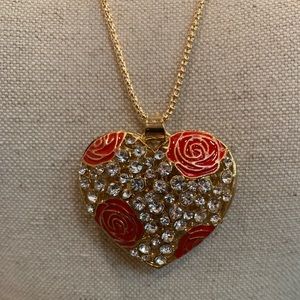 A gold heart-shaped pendant with a red rose design on the front and a diamond-studded back is displayed against a white background. | Betsey Johnson Colorful Heart Necklace NWT | 86eee6a6c74ef95abcc5c81319b355b413324eb92e05093561181e840958f00f | 000000011346 | 0 | 0 | 22 | 6 | 0 | 0 | |