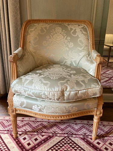 A vintage armchair with a light blue and beige patterned fabric is placed on a patterned rug. The armchair has ornate wooden legs and a curved backrest with a similar patterned fabric. | PAIR FINE Louis XVI Style BERGERE CHAIRS TUB late 20th Century CARVED FRAME silk | 26c7dce91eabf26cfd6f1af225310b3e50fac0f68f5bc1242f3255504ef6a8e4 | 000000011333 | 0 | 0 | 32 | 14 | 0 | 0 | |