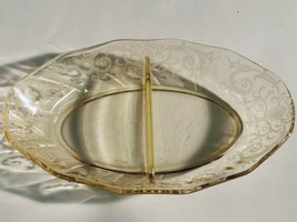 A clear glass plate with a decorative edge and a central design sits on a white surface. | Vintage Fostoria "Versailles" Etched Topaz Divided Relish Dish Bowl *Rare* - $35.64 | 41b4f5b6ad2a51813a3c8a51b2ddaf91146d2196699dc403d7c115f1812cece1 | 000000011341 | 0 | 0 | 17 | 12 | 0 | 0 | |