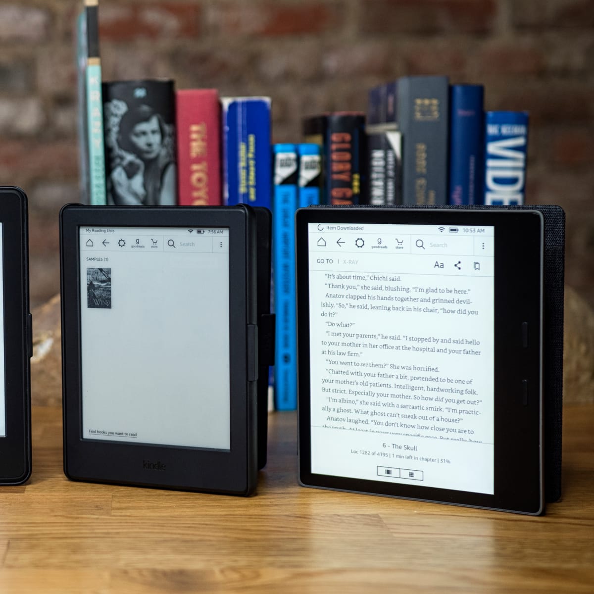 Three tablets are displayed on a wooden surface, each with a different book cover visible on the screen. The tablets are arranged in a row, with the leftmost tablet having a book cover with a woman's face, the middle tablet showing a book cover with a heart, and the rightmost tablet displaying a book cover with a man's face. The tablets are placed in front of a brick wall with a bookshelf behind them, which contains various books with different titles and colors. | The Best Kindles of 2019 - Reviewed Laptops | 32297e169108839e10f0f7f8d4c63395167d3a0c7f90a459b4e53c91f53f1935 | 000000011376 | 0 | 0 | 83 | 8 | 0 | 0 | |