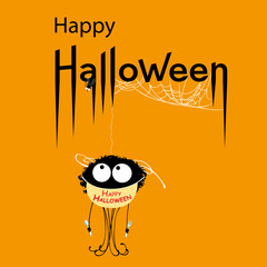 A cartoon character with a black body and a white face is hanging from a spider web. The character has a happy expression with a wide smile and large eyes. It is wearing a red and white 'Happy Halloween' sign around its neck. The background is a solid orange color, and the character is positioned in the center of the image. | Happy Halloween card. Voracious spider in Happy Halloween apron. Vector Illustration | 10fba7459391839ff98da9d2fdab1db873d40492103eeafdcacec6100cea1eb3 | 000000011315 | 0 | 0 | 61 | 11 | 0 | 0 | |