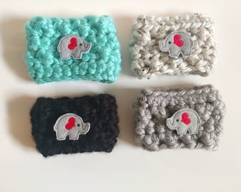 A set of four knitted elephant-themed coasters is displayed on a white background. Each coaster has a different color and a small elephant design with a heart on its ear. The colors are teal, black, gray, and light blue, with the teal coaster being the largest and the light blue coaster being the smallest. | Crochet Elephant Coffee Mug Cozy | 8983b68c8a5f84c4975f6d4f06a3717a81e5cd1c5bd34df10c46fe3999125a7f | 000000012463 | 0 | 0 | 54 | 5 | 0 | 0 | |