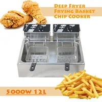 A stainless steel deep fryer with two baskets is displayed on a white background. The fryer has a digital control panel and is accompanied by a pile of french fries on the right side. The image includes a promotional text at the bottom, which reads 'DEEP FRYER FRYING BASKET CHIP COOKER 500W 12L'. | 220V 5000W 12L Double Oil Cylinder Restaurant Equipment Kitchen Equipment Pressure Fryer Machine Potato Fryer Air Fryer | 91c80427f87b3deebc52ebf3a089e7a55f4869cbbf0bb899a5c3da40c8199056 | 000155327448 | 0 | 0 | 53 | 17 | 0 | 0 | |