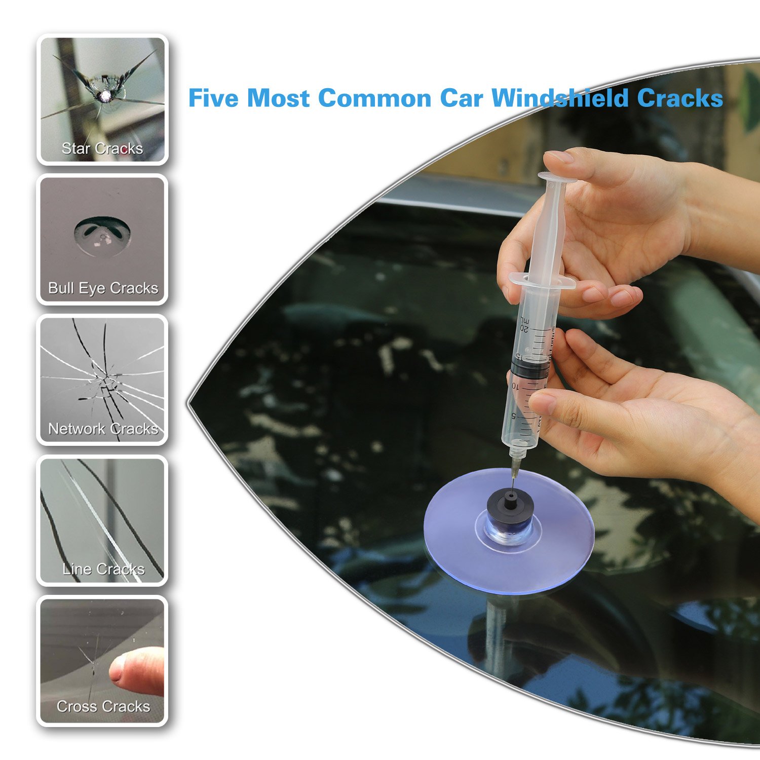 A hand is holding a syringe with a purple cap, injecting a clear liquid into a purple CD that is placed on a car windshield. The CD is on the driver's side of the windshield, and the car's interior is visible. The image is part of a larger circular diagram with various sections labeled 'Five Most Common Car Windshield ... | Fly5D DIY Windshield Glass Repair Kit Auto Car Windscreen Wind Glass Kit For Chip Crack (A) by Fly5D (Image #2) | e5cfc60673b7ae908f99025975ba004d523b62408877a582aff042b58d846b6d | 000155327558 | 0 | 0 | 84 | 20 | 0 | 0 | |