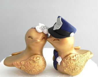 A pair of golden chocolate dolphins with intricate designs are positioned on a white surface. One dolphin is wearing a blue police officer's hat with a badge, and the other is adorned with a white bow. | Police Love Birds Wedding Cake Topper, Gold, Silver and White, Bride and Groom Keepsake, Fully Personalized | 349136ed9bf482bda79b12cbfc9bf8c7a4abae222164332ea097264f736c8f84 | 000155327424 | 0 | 0 | 36 | 16 | 0 | 0 | |