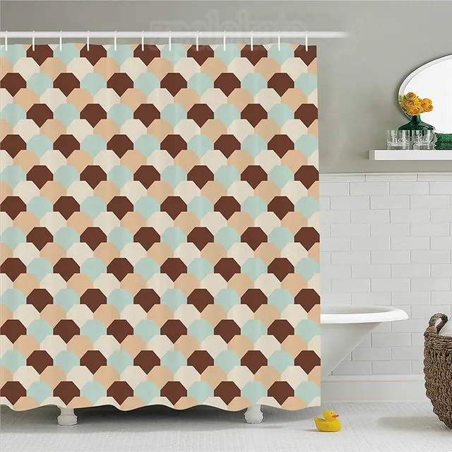 A bathroom with a shower curtain featuring a geometric pattern with shades of brown, beige, and blue. The shower curtain is partially drawn, revealing a white bathtub with a white shower curtain rod above it. To the right of the bathtub, there is a white tiled wall with a small shelf holding a yellow vase with yellow f... | abstract shower curtain entwined comb like mesh pattern hexagonal rh aliexpress com bedroom decor stores bathroom decor sets at walmart | 14c88c2c7bffe5bc4159699d8dcb3dc0ce0921dba5367f60005a26a475beb6db | 000155328434 | 0 | 0 | 75 | 20 | 0 | 0 | |