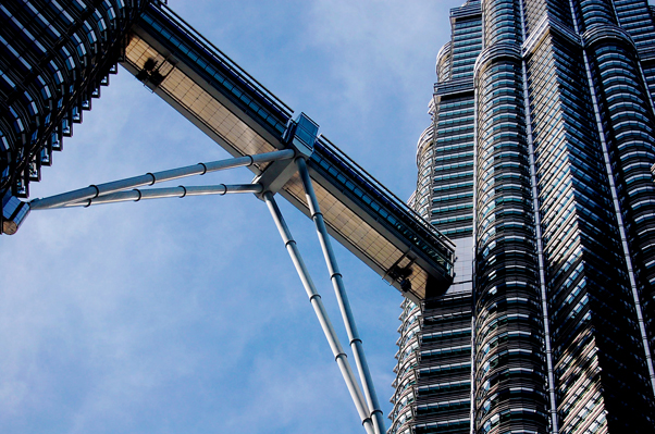 A modern cityscape featuring a tall skyscraper with a unique, curved design. The building is predominantly blue and grey, with a series of vertical lines running up its facade. A pedestrian bridge with a white support structure is visible in the foreground, connecting the building to another structure. The sky is clear... | bowdywanders.com Singapore Travel Blog Philippines Photo :: Malaysia :: Petronas Twin Towers - Malaysia's Structural Icon | 17508114c08354409affebaab497cf075fa14e0acd71479e0c440130342b8fdd | 000155328911 | 0 | 0 | 64 | 16 | 0 | 0 | |