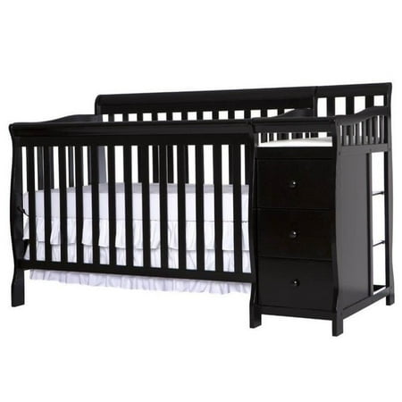 A black modern crib with a simple design, featuring a flat top rail, vertical slats, and a minimalist headboard and footboard. The crib has a black drawer unit with two drawers, one on each side, and a white mattress with a white sheet. | Dream on Me Brody 4-in-1 Fixed-Side Convertible Crib and Changing Table Combo, Black | b6f6dd8e2d324dd71f35274dddafb38432cfb978bea03ef4297a6b2622611822 | 000155329523 | 0 | 0 | 43 | 13 | 0 | 0 | |