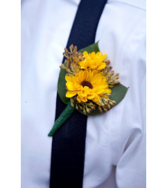 A person is wearing a white shirt with a black tie and a yellow flower with green leaves attached to the tie. | MINI SUNFLOWER BOUTONNIERE FOR LAPEL OR SUSPENDERS | 2f37a3abca2e327d411afc53af459ac83cffa6cb430e182fbb219a5f972b2228 | 000155330508 | 0 | 0 | 22 | 7 | 0 | 0 | |