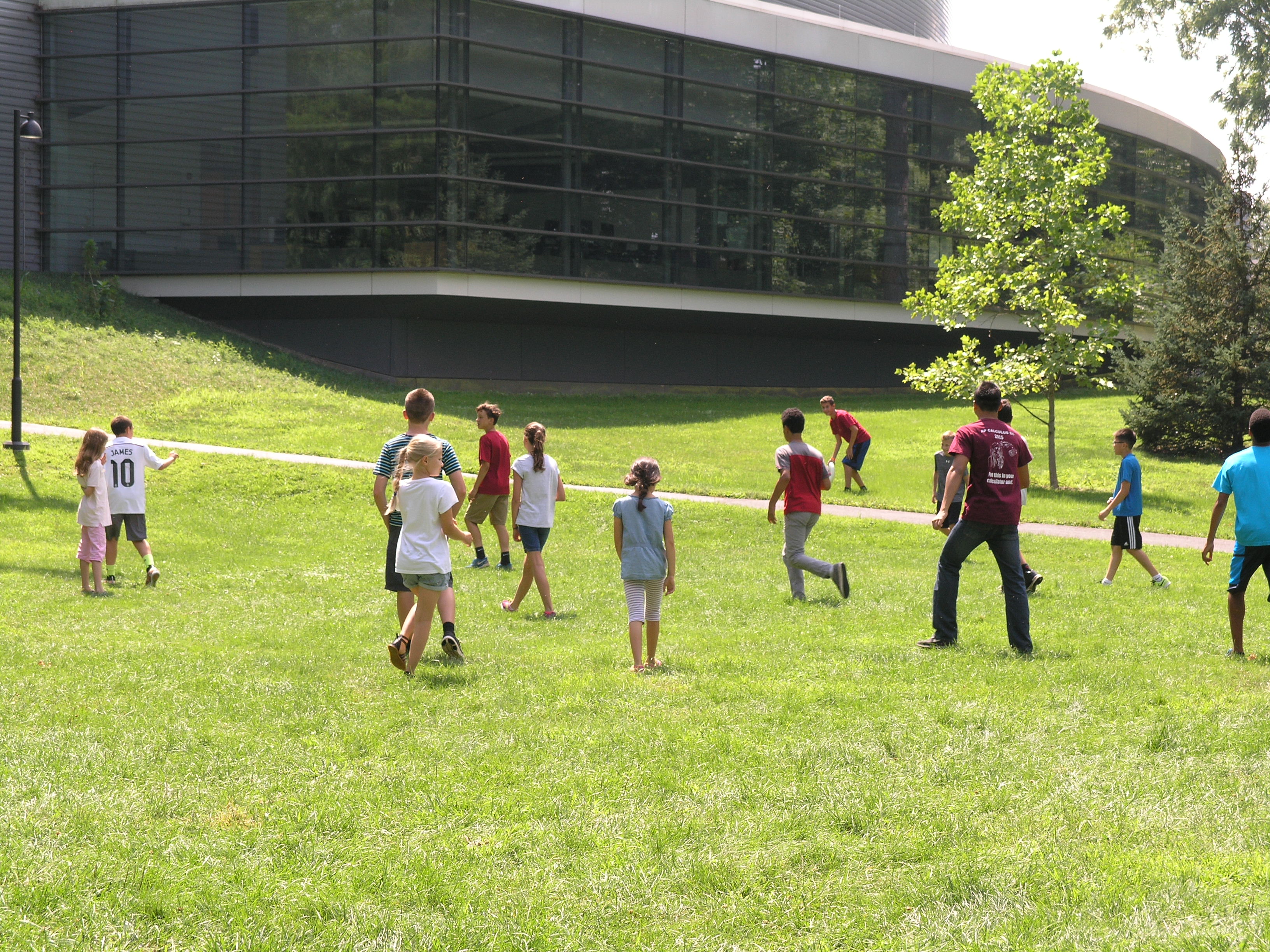 A group of children are playing a game of frisbee in a grassy field with a large building in the background. The children are wearing casual clothing, and there are trees and a clear sky above. | A fun game of ultimate Frisbee allows the students to get a break from lectures to have fun and further build their communities and memories from CAMP. | 5c126043cceb16332e1b2b88196f08d4d6820ad1732d7d077f48dd5023ea8efe | 000155330764 | 0 | 0 | 36 | 27 | 0 | 0 | |