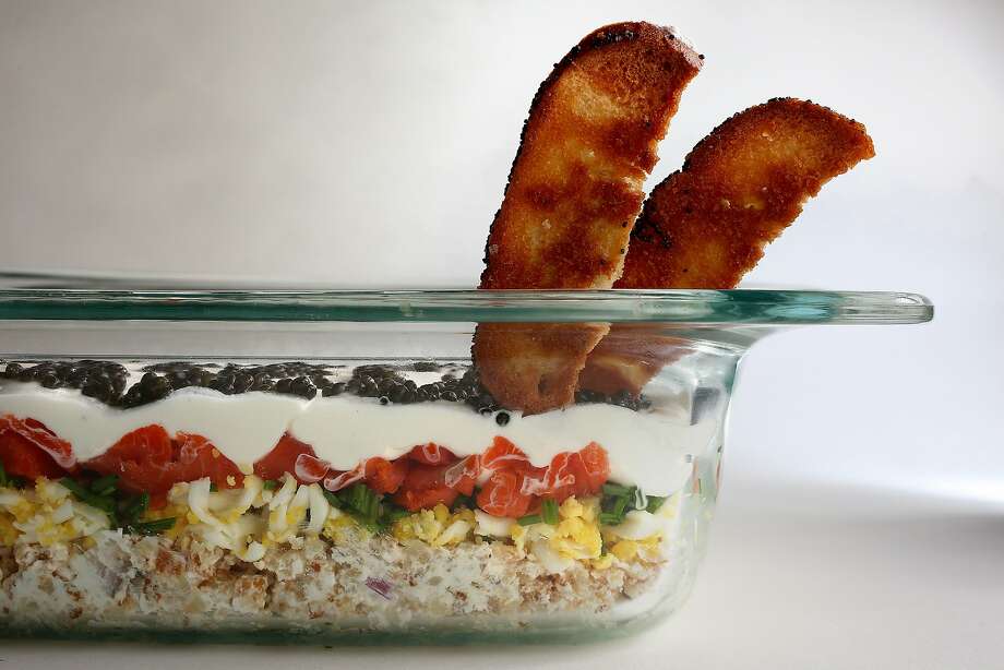 A clear glass bowl filled with a layered salad consisting of lettuce, tomatoes, cheese, and a sauce, topped with two pieces of toast. The bowl is placed on a surface with a white background. | Serve Michael Mina's Seven Layer Dip with toasted bagel chips. Photo: Liz Hafalia, The Chronicle | 13374a5084b8d53308f9fd3b89331b550405f5df9e2e6b56e522f3c5b390dd2f | 000000013585 | 0 | 0 | 34 | 15 | 0 | 0 | |