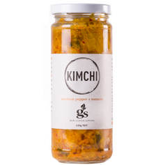 A glass jar filled with kimchi, a traditional Korean fermented vegetable dish, is displayed against a white background. The jar has a white lid and a label with the word 'Kimchi' in a circular design. The kimchi inside the jar appears to be a mix of vegetables, likely cabbage and carrots, with a spicy red sauce. The label also includes text and a logo, but the details are not clear. | Kimchi Szechuan Pepper & Turmeric | 25187d1e28380b6ab0adbc8e3156378a431ead61d268bea7f4317c2735ae9e61 | 000000013582 | 0 | 0 | 70 | 5 | 0 | 0 | |