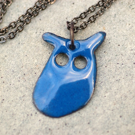 A blue ceramic owl pendant with a glossy finish is hanging from a silver chain. The owl has a round head with two black eyes and a small beak. The body is smooth and rounded, and the wings are spread out. The pendant is placed on a textured surface with a grey background. | Copper Enameled Pendant | a961b64a27fef838efef7aa7ed44ca10e02392663bf2b6f778724dee6926f1ec | 000000013810 | 0 | 0 | 53 | 3 | 0 | 0 | |