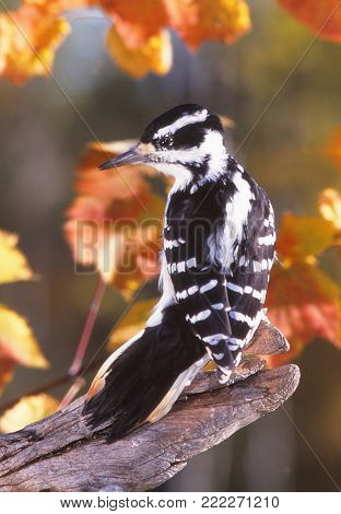 A black and white bird with a long beak is perched on a tree branch surrounded by autumn leaves. | A female Hairy Woodpecker on a fall day. | cf7ba4f727b341f92983053b4ce015088d3490a70c0bb7a82098e498a334f395 | 000000013842 | 0 | 0 | 19 | 8 | 0 | 0 | |