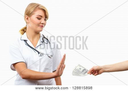 A digital illustration of a woman with blonde hair wearing a white shirt with a stethoscope around her neck. She is holding up her hand with her palm facing forward, as if to stop something. In the background, there is a hand holding a wad of cash. The image has a white background and includes a watermark with the text 'BIGSTOCK' and a website URL. | Woman doctor with stethoscope refusing bribes or kickbacks currencies dollar patient giving money for medical services concept of corruption | 05e01253cc9a4626dbf43f05be55978040483d98df603b219f329e886fe0f6cc | 000000013827 | 0 | 0 | 65 | 19 | 0 | 0 | |