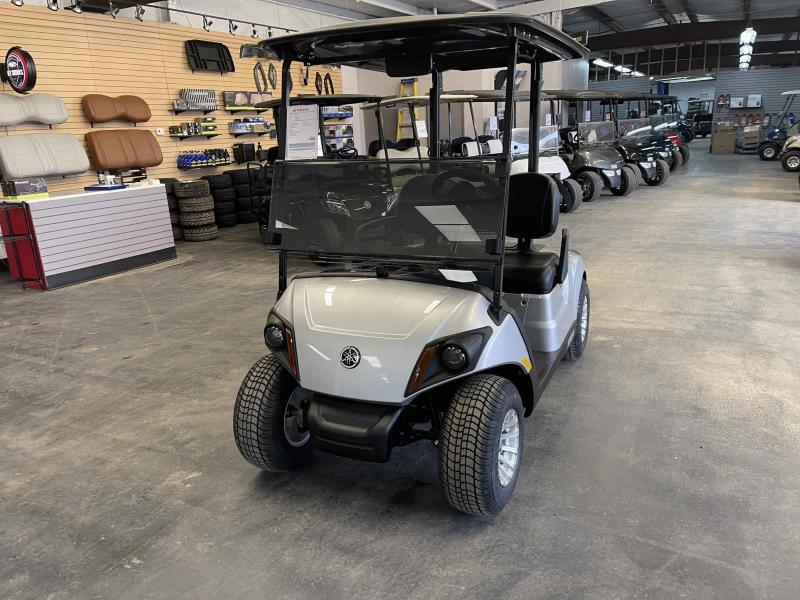 A silver golf cart with a black canopy is parked inside a showroom with various golf carts and accessories in the background. | 2021 Yamaha The Drive2 - PTV (Gas EFI) Golf Cart | 49d01bfb91a6d44e6814af5e0eb1ae05a6637b20ac9731814226d2740c566d82 | 000000013964 | 0 | 0 | 22 | 10 | 0 | 0 | |