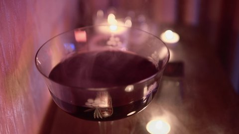 A glass filled with a dark red liquid, possibly wine, is placed on a reflective surface. The glass is illuminated from behind, creating a warm glow and a reflection on the surface. The background is dark, and there are multiple light sources creating a bokeh effect with light circles scattered around the glass. | Magic mystic ritual, fake blood or red wine, occult esoteric ritual, witch, candles | e3df9da8840885528a047f226e4e6b29d386a591fe93fa9e60822d1984cb2a79 | 000000014071 | 0 | 0 | 53 | 13 | 0 | 0 | |